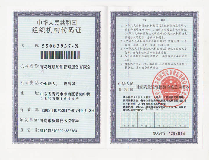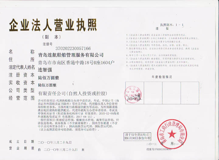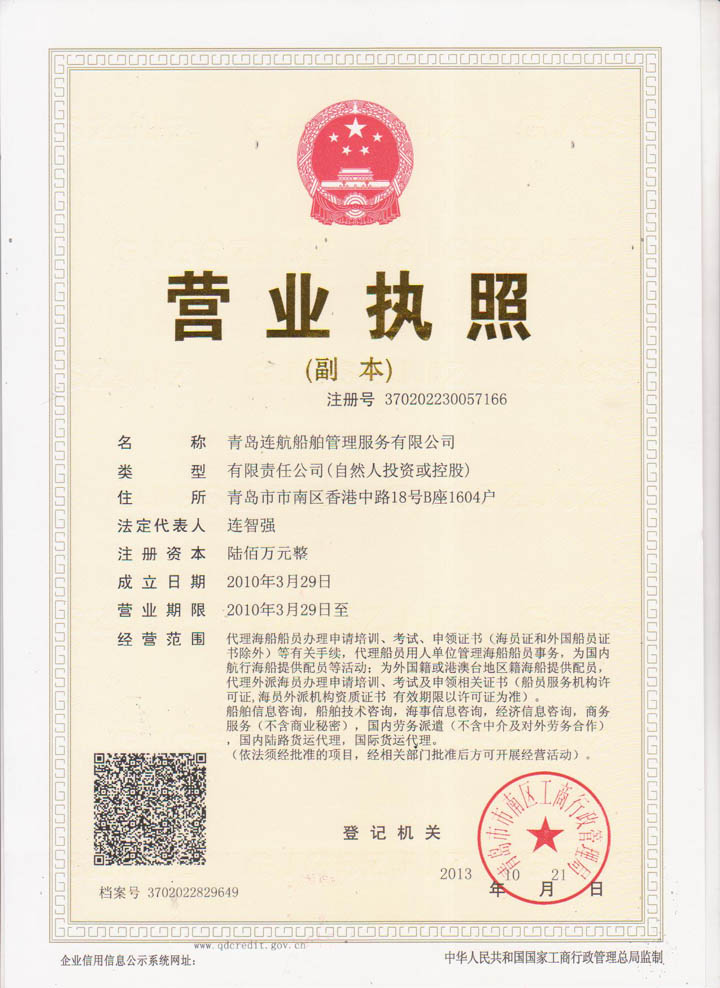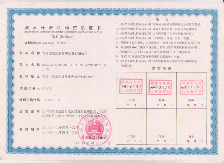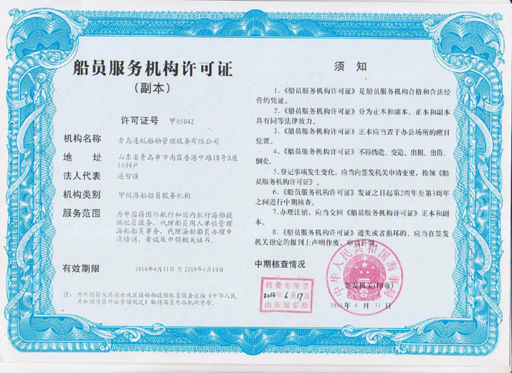 2012年04月青島連航船舶管理服務有限公司取得《海員外派機構(gòu)資質(zhì)證書》,為海洋船舶提供配員,代理船員用人單位管理海洋船舶船員事物,代理海洋船舶船員申請培訓、考試、申請證書等業(yè)務。