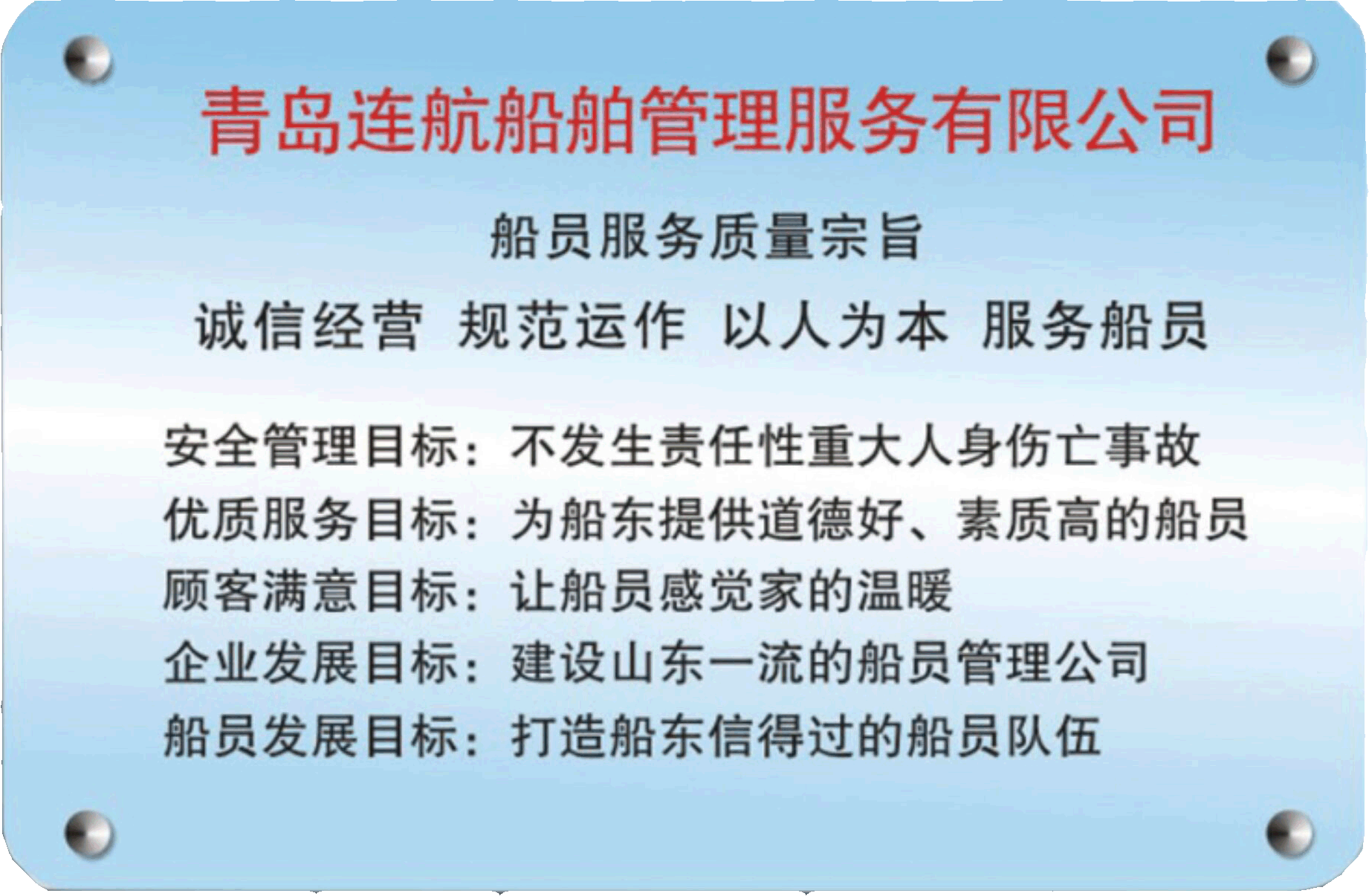 青島連航船舶管理服務有限公司(以下簡稱公司)是經(jīng)中華人民共和國海事局批準認可的海員外派服務機構(gòu)(海員外派資質(zhì)證書編號:HYWP05016),是國家工商行政管理局注冊批準的股份制企業(yè),注冊資金600萬元。公司主要業(yè)務是代理海船船員辦理申請培訓、考試、申領(lǐng)證書等有關(guān)手續(xù),代理船員用人單位管理海船船員事務,為國內(nèi)外航行海船提供配員與輸出等活動;同時提供信息咨詢、船舶技術(shù)咨詢、海事信息咨詢、經(jīng)濟信息咨詢、商務服務、船舶物料供應、船舶維修、船舶代理貨運代理等服務業(yè)務。