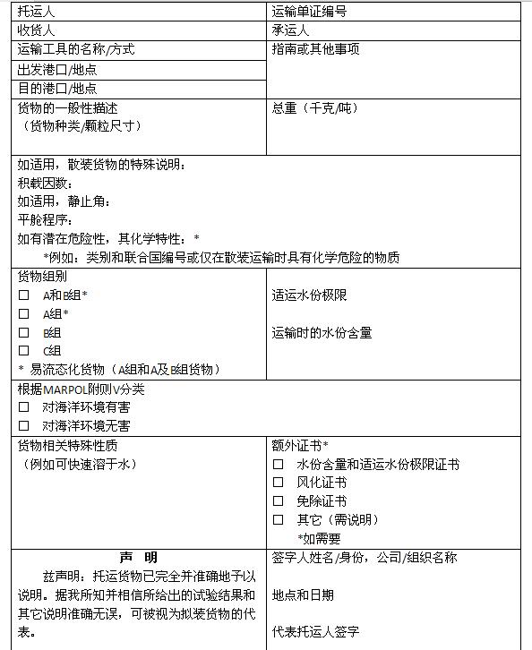 船方應當要求托運人對其托運的貨物是否對海洋環(huán)境有害進行申明(申明格式見附件2),并將申明隨船保存至少兩年。